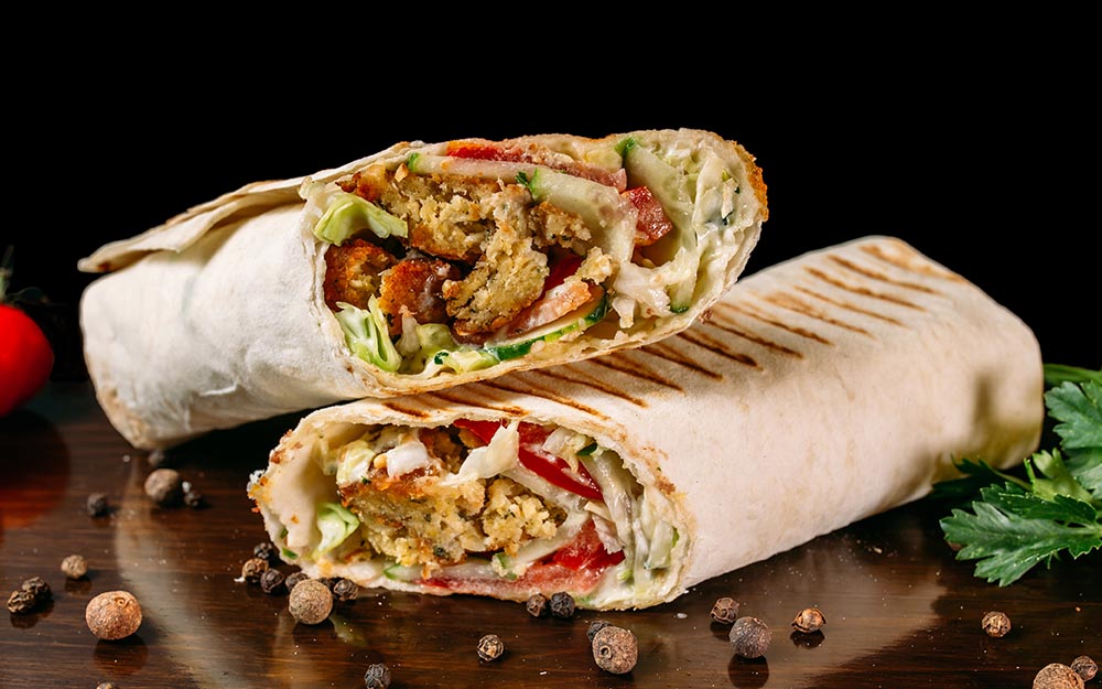 Куриное филе приготовленное на мангале, баварская колбаска, помидоры, морковь по-корейски, огурец маринованный, лук маринованный красный сладкий, зелень, соус фирменный чесночный, соус томатный.