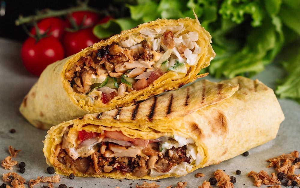 Куриное филе приготовленное на мангале, сыр моцарелла, грибы шампиньоны, помидоры, морковь по-корейски, огурец маринованный, лук маринованный красный сладкий, зелень, соус фирменный чесночный.